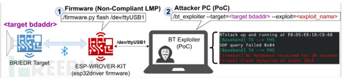 要想发起BrakTooth攻击,需要一个ESP32开发工具包、一个定制的链路管理协议(Link Manager Protocol, LMP)固件和一台计算机来运行概念验证(proof-of-concept, PoC)工具。