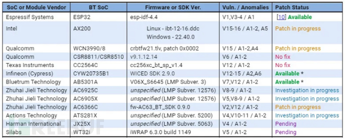 虽然其中一些供应商(例如乐鑫、英飞凌和 Bluetrum Technology)已经针对这些问题发布了补丁,但其他供应商已经承认存在缺陷并仍在开发补丁,或者正在调查影响。在某些情况下(例如高通的CSR8811和CSR8510 SoC或Texas Instruments的CC2564C),不会发布任何修复程序。