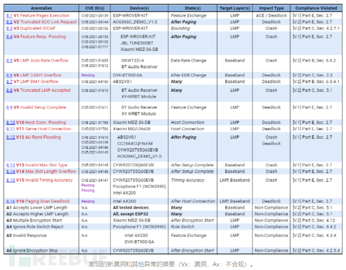 Braktooth收集中的漏洞针对的是LMP和基带层。目前,他们已经被分配了20个标识符,还有几个悬而未决,请参考以下16个问题: