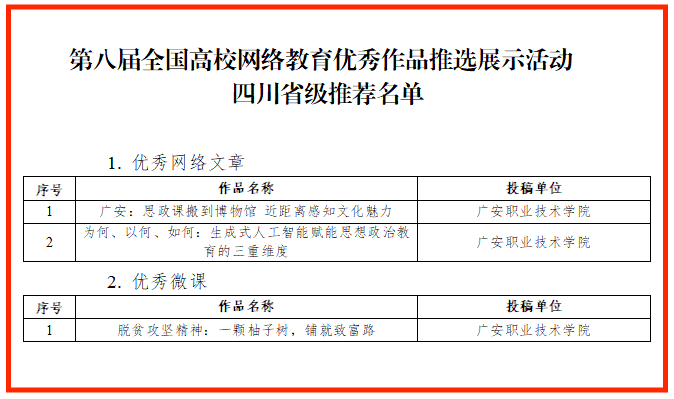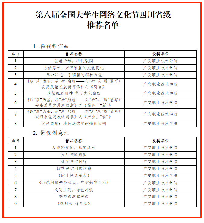 在此次评选中,学校表现突出,17件作品入围《第八届全国大学生网络文化节四川省级推荐名单》,3件作品入围《第八届全国高校网络教育优秀作品推选展示活动四川省级推荐名单》,入围作品总数位列全省高职院校前五,充分展现了学校在网络文化创作与网络教育实践方面的扎实基础和优异水平。