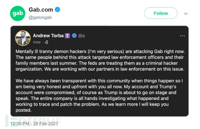 堂堂一家公司的 CTO ,到底能水到什么程度呢?上周,美国开源社交网络服务平台 Gab ,因其 CTO 写的低级Bug受到黑客攻击,导致约 70GB 的数据被窃取。包括 7 万多条信息、4000 多万条帖子,以及哈希密码、明文密码、用户个人资料等。这件事被曝光后,Gab 选择了与 CTO 站在一起一致对外。CEO Andrew Torba 连发两条声明,承认了官网被入侵这一事实。表示公司正受到黑客的勒索,已经向执法部门报告。3月8日,Gab再次被入侵,这次是CEO的账号被盗,黑客用他的账号发帖指责身为CEO的Torba 在面对泄露事件时,甚至不愿意支付 8 个比特币来赎回用户的隐私信息。